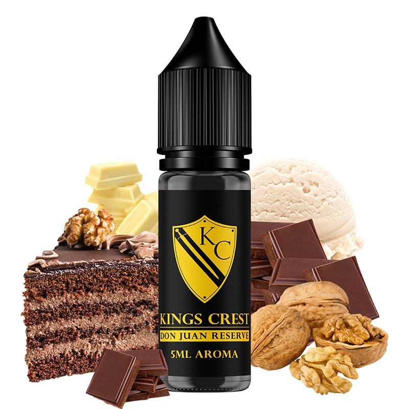 El aroma MiniLongfill Don Juan Reserve de Kings Crest sorprende por su sabor a tarta de chocolate recubierta con mantequilla de nueces pecán y crema batida. ¡Ideal para vapear diariamente!