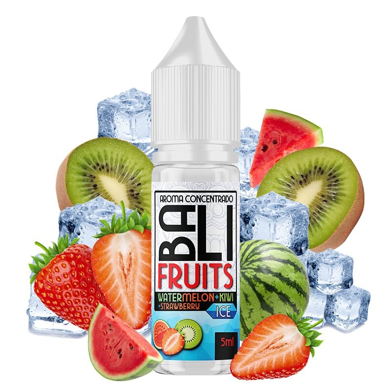 El aroma MiniLongfill Watermelon + Kiwi + Strawberry Ice de Bali Fruits by Kings Crest te sorprenderá por su fusión de sandía, fresas y kiwi sobre un fondo fresco. ¡Una mezcla irresistible para el paladar!